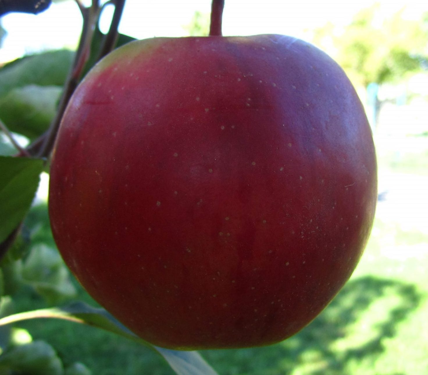 Плоди середні або великі, масою близько 190 г, округлі, майже повністю темно-червоного кольору з чіткими сочевичками.