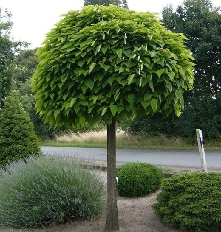 Залежно від висоти щеплення висота становить 3–6 м при діаметрі до 5 м. Листя супротивне або розташоване по три, серцеподібне, 10–15 см завдовжки, зелене протягом сезону. Не утворює квітів.