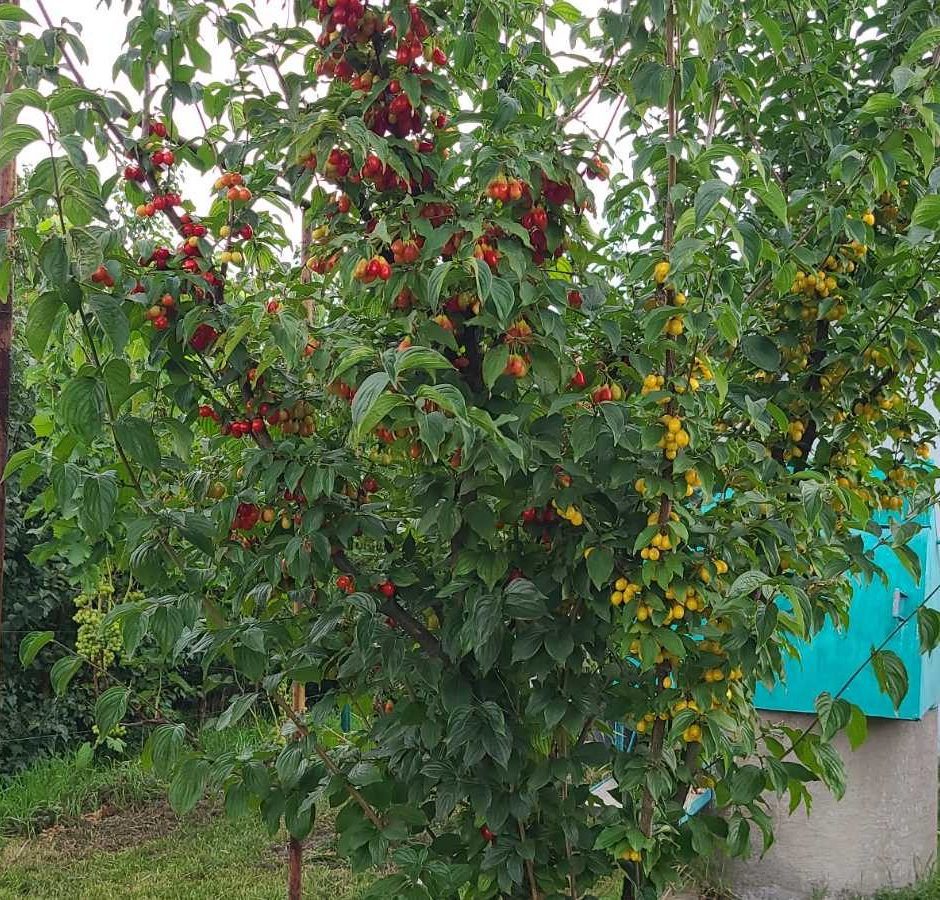 У крону 2024 року щеплений жовтоплідний Янтарний — ранньо-середній сорт із прозорими медово-жовтими плодами масою 3,5–4 г і соковитою десертною м’якоттю. Достигає з кінця липня, тобто врожай із одного дерева розтягується з літа до вересня.