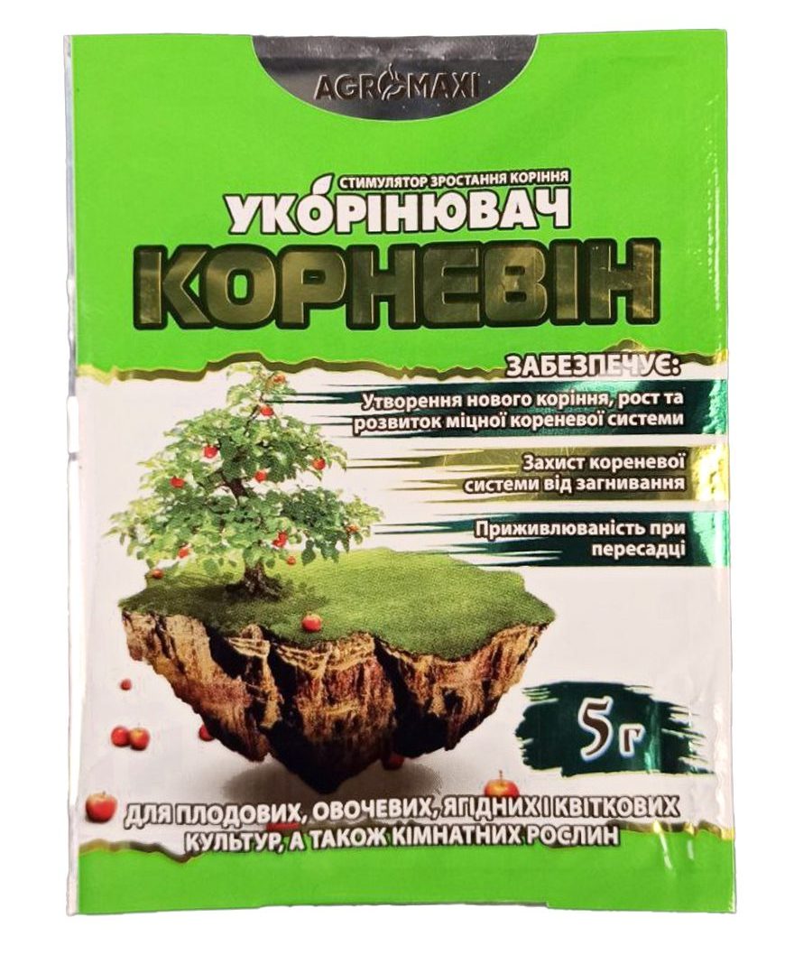 Корневін — стимулятор коренеутворення на основі індолілмасляної кислоти, призначений для покращення укорінення та підвищення приживлюваності рослин при пересадці.