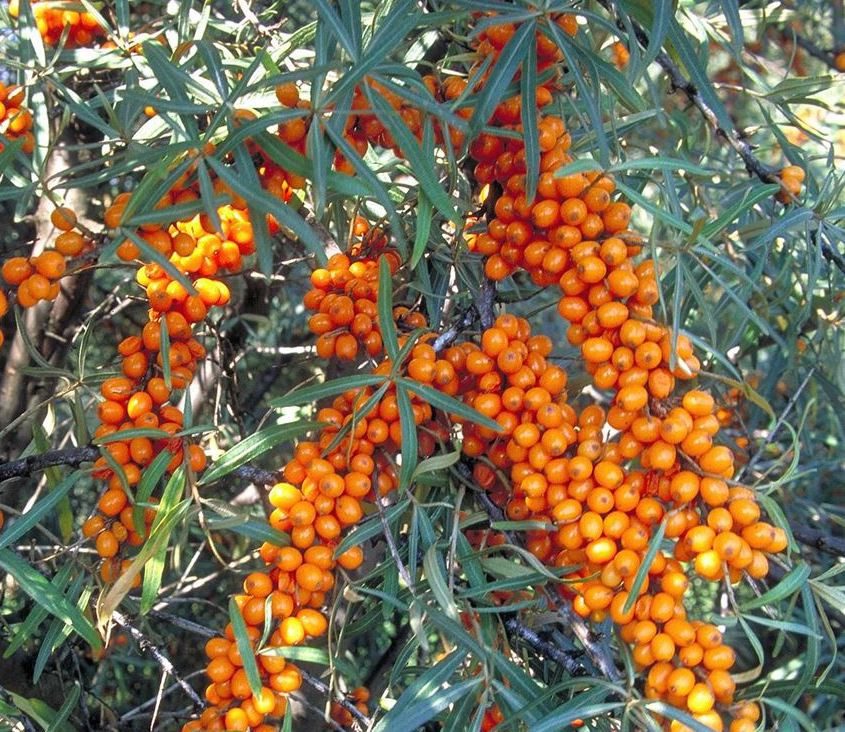 Ягоди дозрівають у серпні–вересні, округлі, 5-7 мм, яскраво-помаранчеві, зібрані у щільні грона. Плоди трохи кислі, але після заморожування стають солодкими.