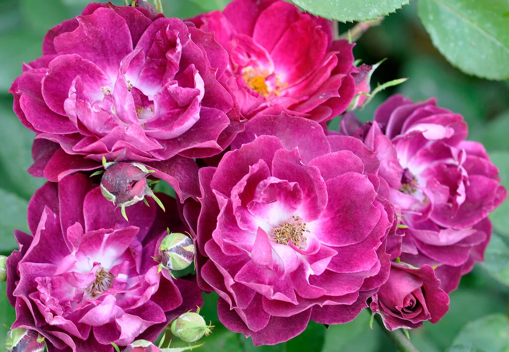 Сорт англійської селекції з глибоким, насиченим забарвленням — квітки починають розпускатися малиновими, поступово набуваючи теплих пурпурових відтінків, що нагадують стиглу малину. Густомахрові, чашоподібні, складені з безлічі вузьких пелюсток, діаметром 7–8 см, із сильним приємним ароматом. Зібрані у великі суцвіття по 5–8 квіток, цвітуть рясно і майже безперервно з літа до осені.