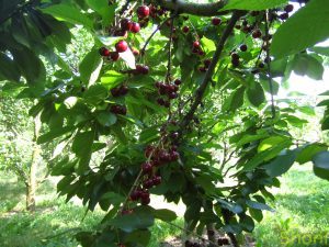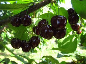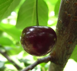 Черешня формує значно більші плоди округлої або серцеподібної форми, які тримаються на міцних плодоніжках і також зібрані в пучки. М’якуш щільніший, але дуже соковитий, з переважно солодким смаком без різкої кислотності. Забарвлення плодів варіює від світло-жовтого до темно-червоного і майже чорного. Шкірка щільніша, що забезпечує кращу транспортабельність. Кісточка велика, легко відділяється у більшості сучасних сортів. Маса плодів у середньому становить 8–12 г, у інтенсивних сортів може досягати 18–20 г.