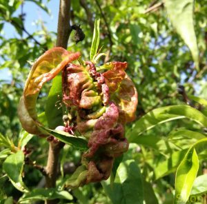 Курчавість листя персика — одна з найнебезпечніших і найпоширеніших хвороб, яка може повністю знищити врожай і сильно ослабити дерево. Вона проявляється на самому початку весни, як тільки розпускаються перші листочки, особливо якщо весна прохолодна і волога. Молоде листя стає неприродно товстим, м’ясистим, набрякає, скручується хвилястими складками, набуває яскравого червоного або рожевого забарвлення з жовтуватими ділянками. Молоді пагони, що несуть уражене листя, сильно відстають у рості, потовщуються, викривлюються. Уражене листя згодом чорніє і опадає вже в червні, дерево залишається майже голим.